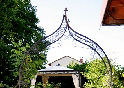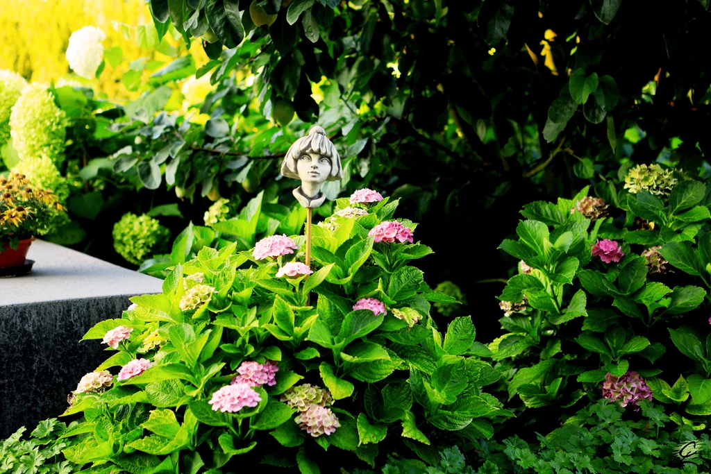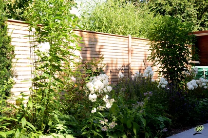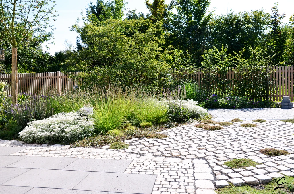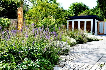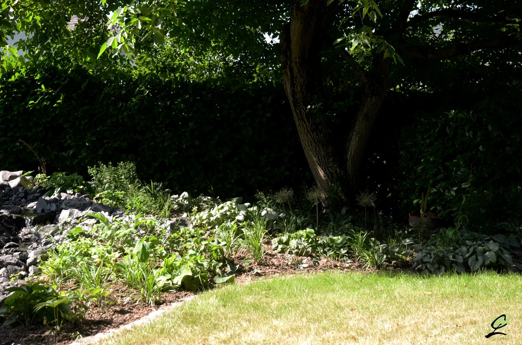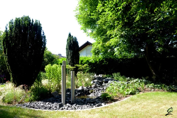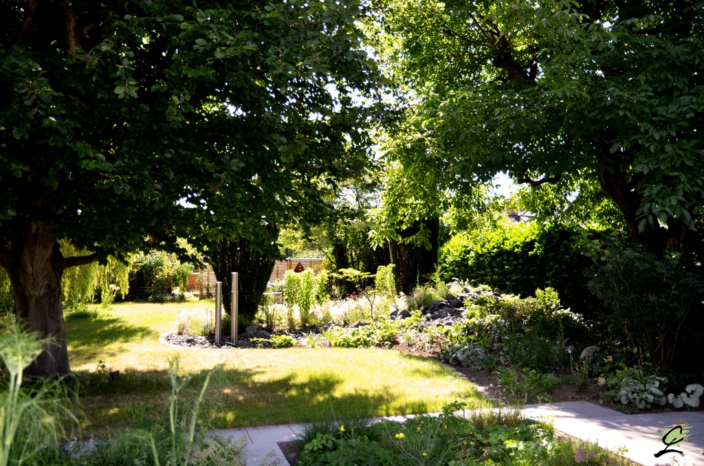 Bei diesem Projekt wurde ein ca. 600 m² großer, in die Jahre gekommener Hausgarten mit drei großen Bestandsbäumen neu gestaltet. Betreten wird der Garten durch einen mit einem Rosenbogen versehenen Weg aus Granitplatten. Linkerhand grenzt an den Weg ein formal gehaltener Staudengarten an. In den unterteilten Beeten steht jeweils eine Strauchrose unterpflanzt mit Gräsern und verschiedenen Kräutern und Stauden. Rechterhand befindet sich eine an einen Bauerngarten erinnernde Staudenpflanzung. Der Weg führt geradewegs auf eine der beiden Terrassen. Dieser Sitzplatz ist geprägt von einem großzügigen Pavillon in italienischem Design und lädt auch an heißen Tagen zum Verweilen ein. Von hier aus bietet sich ein Blick in den Garten und auf den neu gestalteten Bachlauf. Dieser entspringt auf einem kleinen, aufgeschütteten Hügel, der mit verschiedenen Sonnen- und Schattenstauden bepflanzt ist. Geschützt dahinter liegt ein großer, von einer grasartigen Staudenpflanzung geprägter Bereich mit einer sonnigen Loungeterrasse. Verschiedene Cortenstahl-Figuren erzeugen einen Hauch von Afrika.