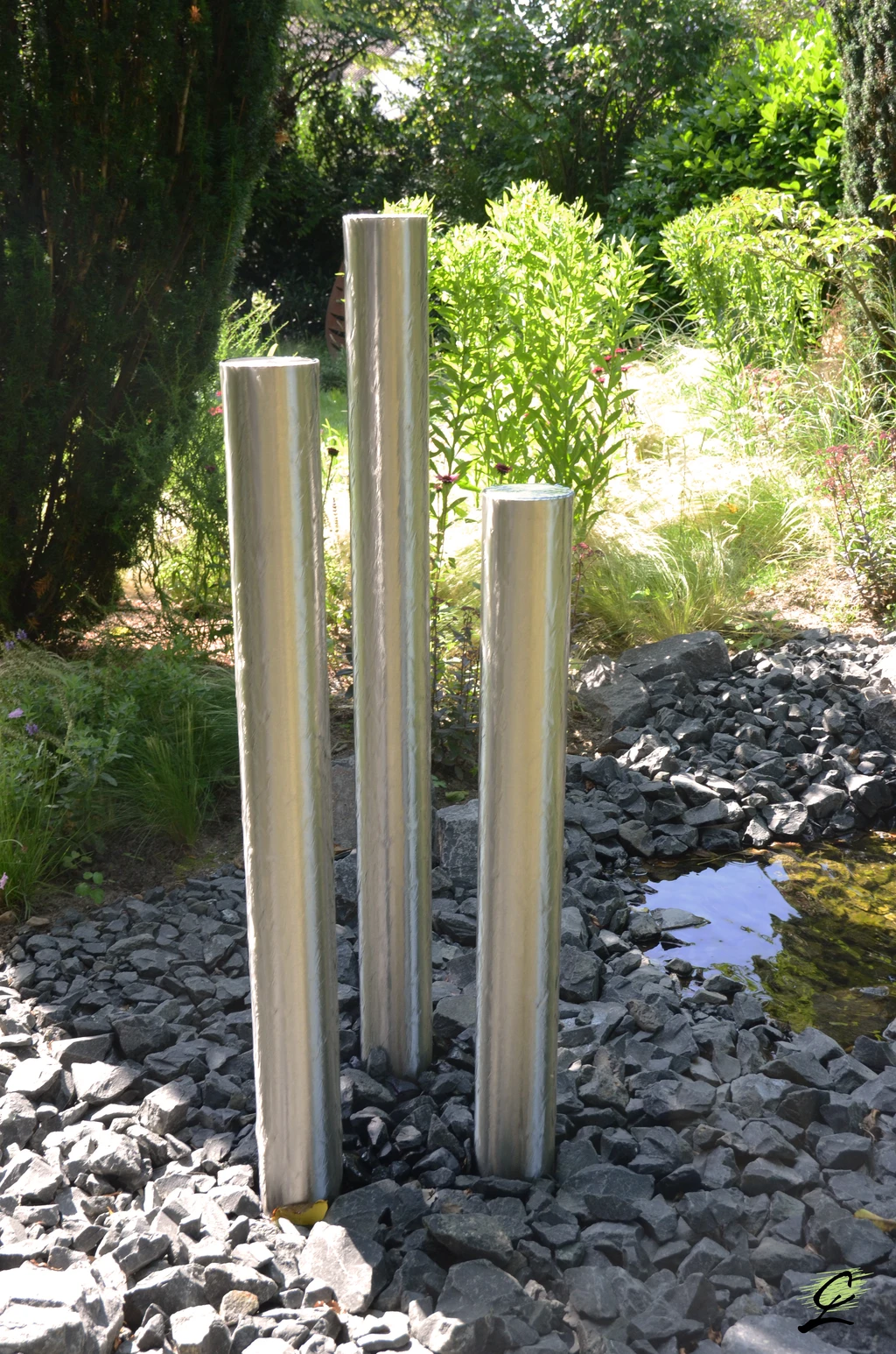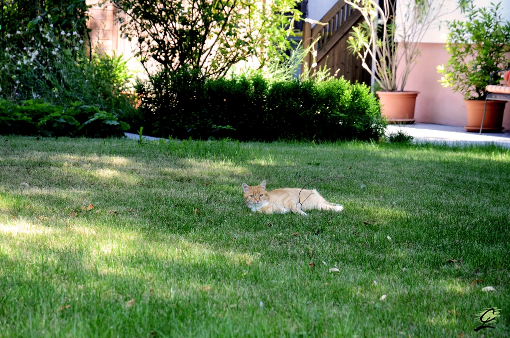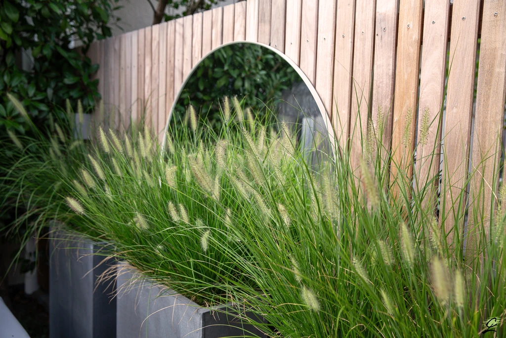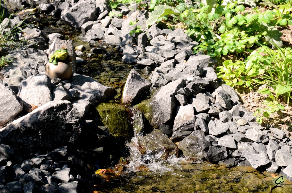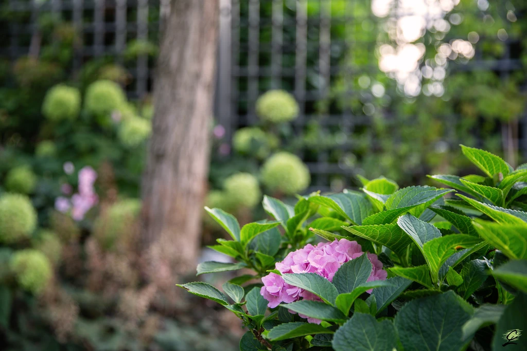 Bei diesem Projekt wurde ein ca. 600 m² großer, in die Jahre gekommener Hausgarten mit drei großen Bestandsbäumen neu gestaltet. Betreten wird der Garten durch einen mit einem Rosenbogen versehenen Weg aus Granitplatten. Linkerhand grenzt an den Weg ein formal gehaltener Staudengarten an. In den unterteilten Beeten steht jeweils eine Strauchrose unterpflanzt mit Gräsern und verschiedenen Kräutern und Stauden. Rechterhand befindet sich eine an einen Bauerngarten erinnernde Staudenpflanzung. Der Weg führt geradewegs auf eine der beiden Terrassen. Dieser Sitzplatz ist geprägt von einem großzügigen Pavillon in italienischem Design und lädt auch an heißen Tagen zum Verweilen ein. Von hier aus bietet sich ein Blick in den Garten und auf den neu gestalteten Bachlauf. Dieser entspringt auf einem kleinen, aufgeschütteten Hügel, der mit verschiedenen Sonnen- und Schattenstauden bepflanzt ist. Geschützt dahinter liegt ein großer, von einer grasartigen Staudenpflanzung geprägter Bereich mit einer sonnigen Loungeterrasse. Verschiedene Cortenstahl-Figuren erzeugen einen Hauch von Afrika.