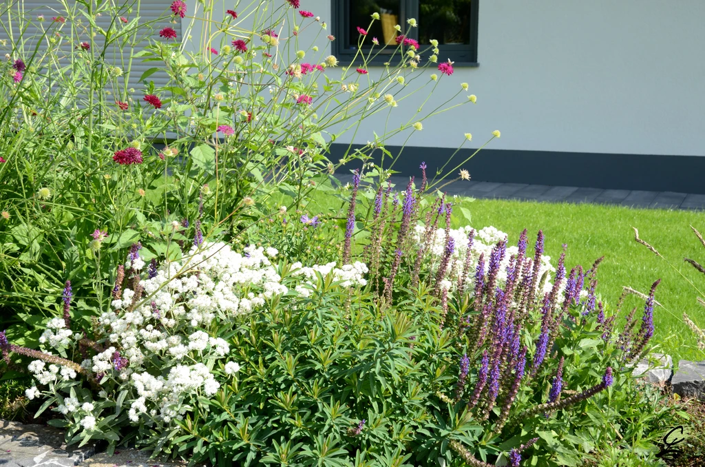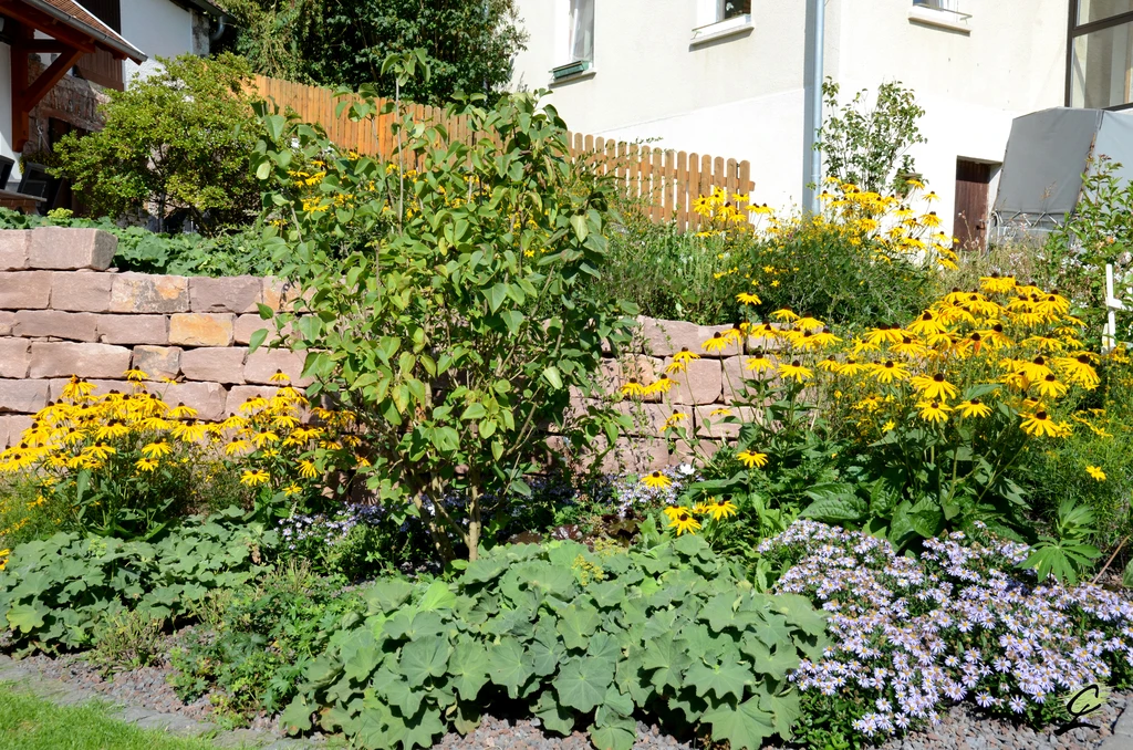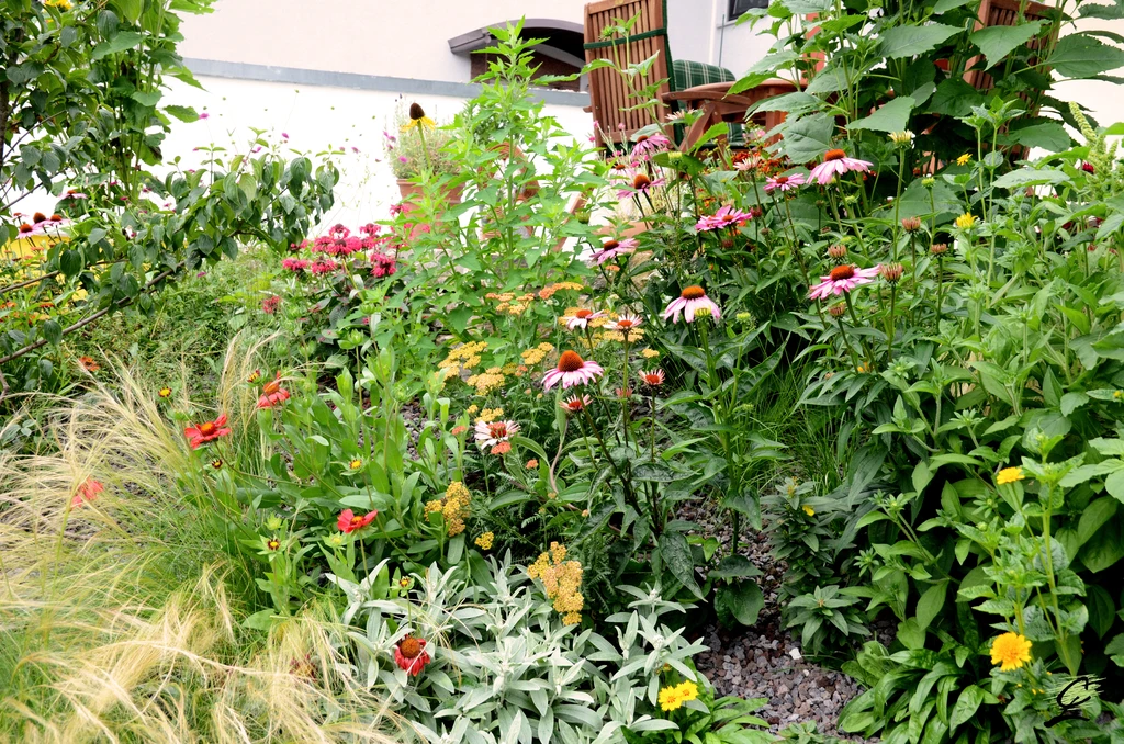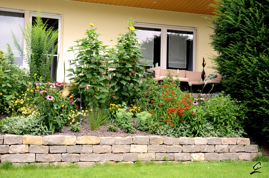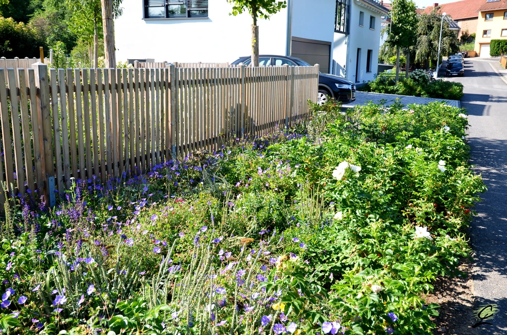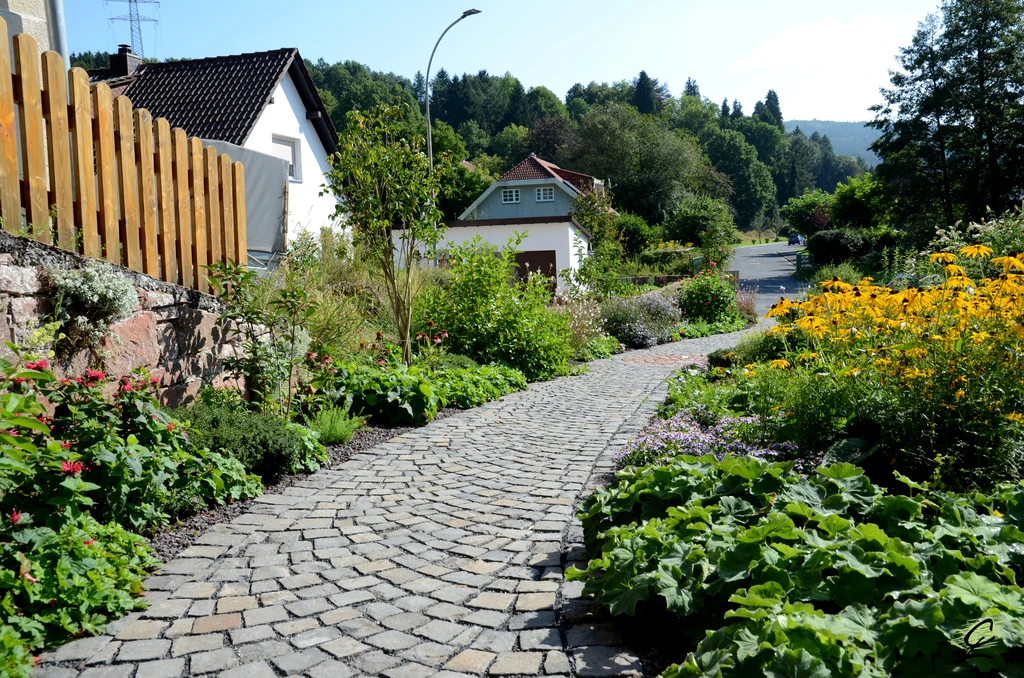 Der naturnahe Hausgarten ist auf einem ca. 600 m² großen Grundstück mit Neubau in Schöneck entstanden. Die Planung erfolgte in Zusammenarbeit mit Gartenplaner Christian Wiegand. Schon ein Blick von der Straße lässt die Prägung des Gartens erahnen. Die artenreiche Pflanzung ernährt verschiedene Insekten das ganze Jahr über und erfreut den Betrachter mit einer Blütenpracht von April bis November. Die an der Straße gepflanzten Wildrosen schützen mit ihren Stacheln die Beete vor Hunden. Der schlichte Holzzaun bietet einen partiellen Schutz, lässt aber den Blick aus dem Garten in das ihn umgebende Grün der Felder zu. Die Einfahrt ist aus heimischem Muschelkalk-Kleinsteinpflaster erstellt und geht im Eingangsbereich fließend in die aus heimischer Basalt-Lava hergestellte Terrasse über. Zur Auflockerung der großzügigen Terrasse sind die Randbereiche mit Muschelkalk-Mosaik ausgepflastert. Für eine gelungene Verbindung des Kiesstreifens mit dem restlichen Garten sorgt die ebenfalls aus Muschelkalkpflaster hergestellte Einfassung. Der zum Bach abfallende Bereich des Grundstückes ist mit Quadern abgetreppt und durch die flächige Bepflanzung auch bei höheren Wasserständen gut geschützt. Im Bereich zur Straße wurde ein Naschgarten mit verschiedenen Obstgehölzen und Beerensträuchern gebaut.