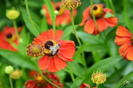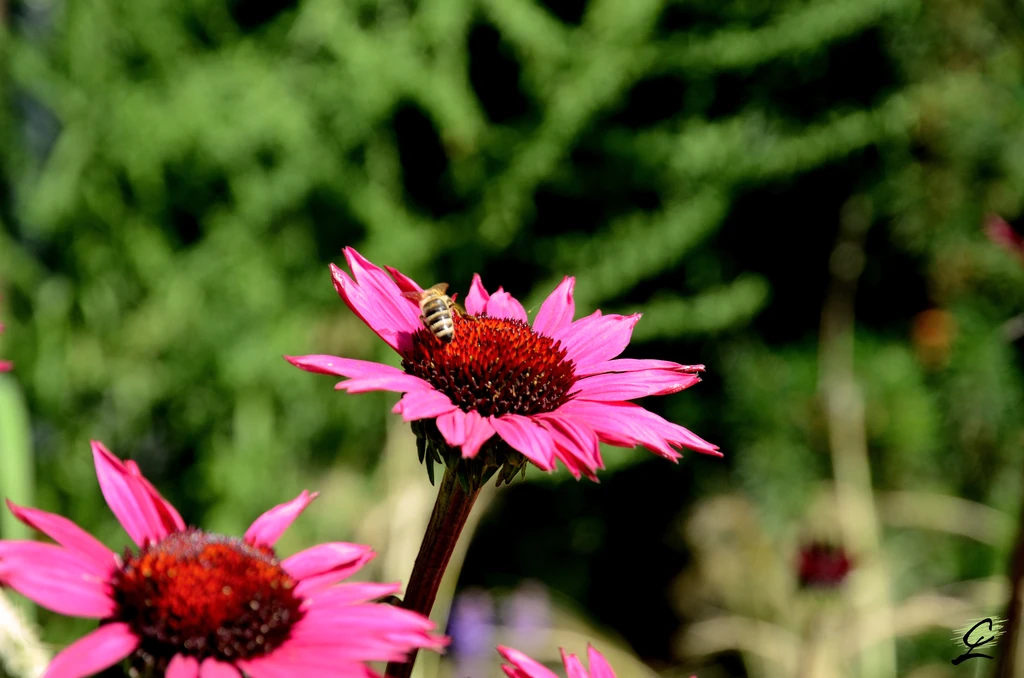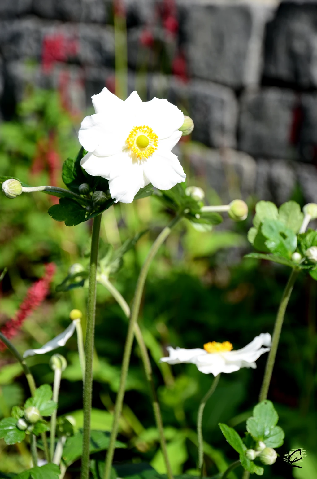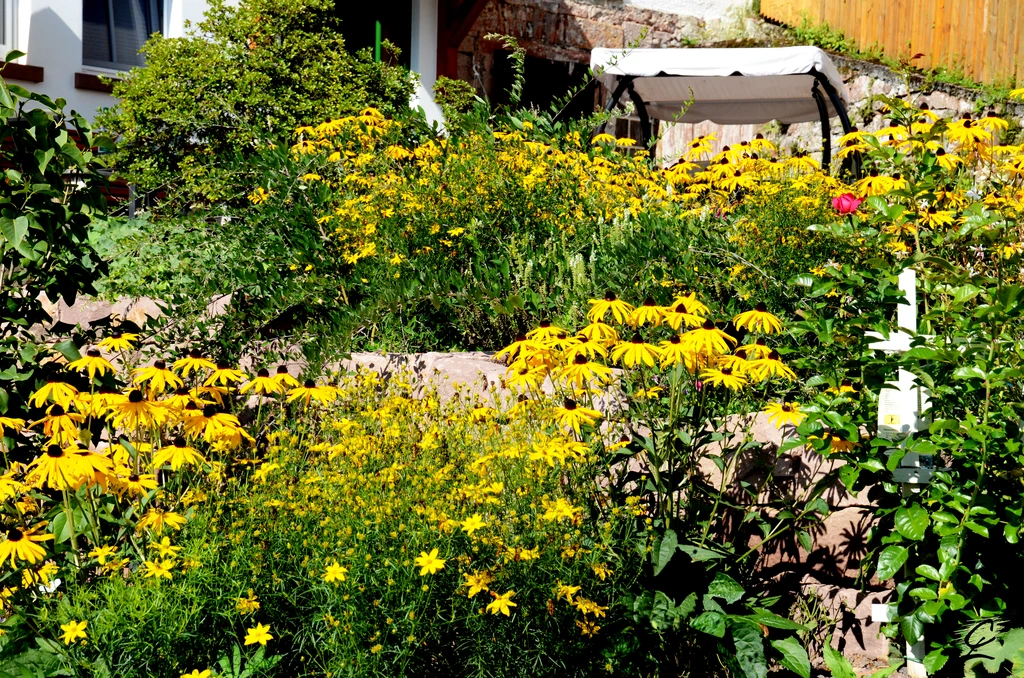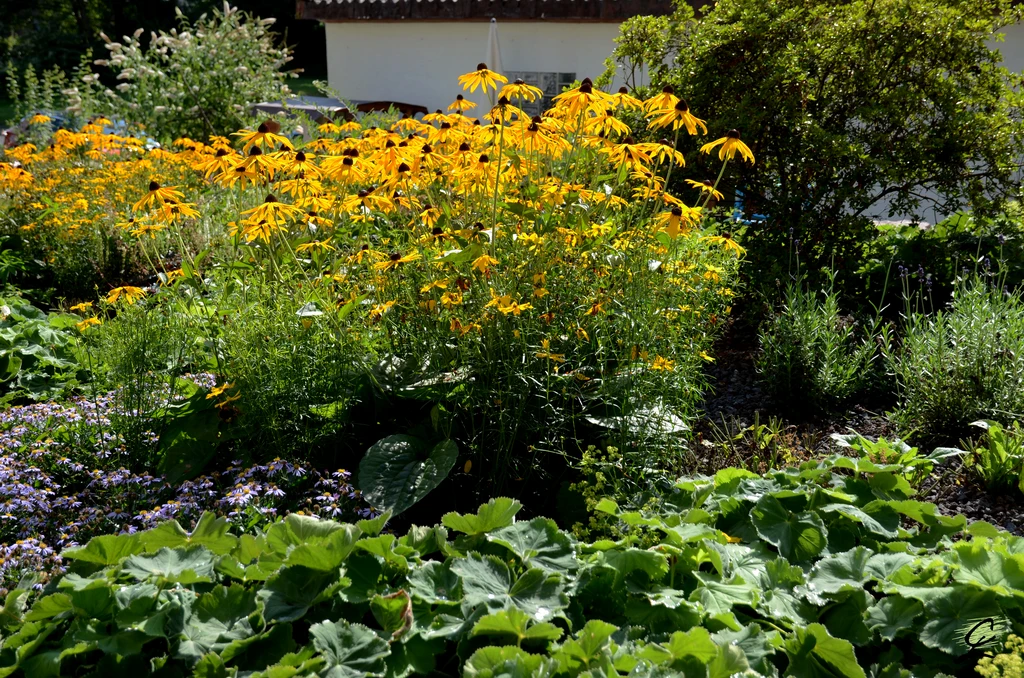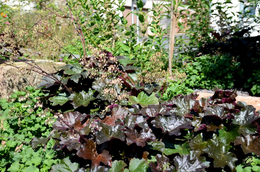 Der naturnahe Hausgarten ist auf einem ca. 600 m² großen Grundstück mit Neubau in Schöneck entstanden. Die Planung erfolgte in Zusammenarbeit mit Gartenplaner Christian Wiegand. Schon ein Blick von der Straße lässt die Prägung des Gartens erahnen. Die artenreiche Pflanzung ernährt verschiedene Insekten das ganze Jahr über und erfreut den Betrachter mit einer Blütenpracht von April bis November. Die an der Straße gepflanzten Wildrosen schützen mit ihren Stacheln die Beete vor Hunden. Der schlichte Holzzaun bietet einen partiellen Schutz, lässt aber den Blick aus dem Garten in das ihn umgebende Grün der Felder zu. Die Einfahrt ist aus heimischem Muschelkalk-Kleinsteinpflaster erstellt und geht im Eingangsbereich fließend in die aus heimischer Basalt-Lava hergestellte Terrasse über. Zur Auflockerung der großzügigen Terrasse sind die Randbereiche mit Muschelkalk-Mosaik ausgepflastert. Für eine gelungene Verbindung des Kiesstreifens mit dem restlichen Garten sorgt die ebenfalls aus Muschelkalkpflaster hergestellte Einfassung. Der zum Bach abfallende Bereich des Grundstückes ist mit Quadern abgetreppt und durch die flächige Bepflanzung auch bei höheren Wasserständen gut geschützt. Im Bereich zur Straße wurde ein Naschgarten mit verschiedenen Obstgehölzen und Beerensträuchern gebaut.