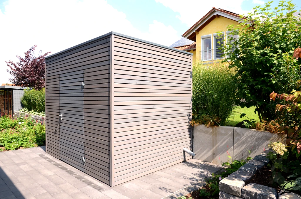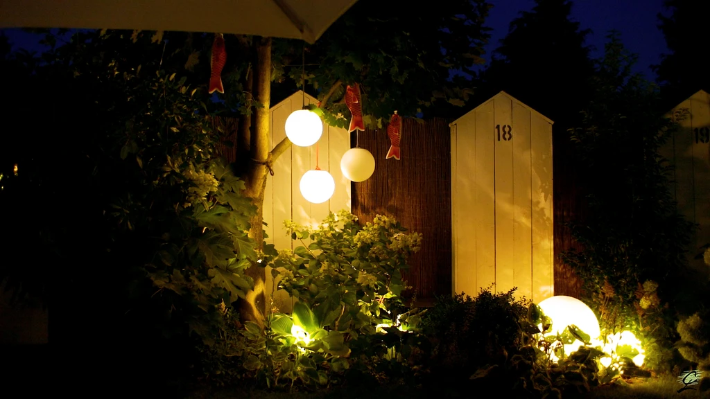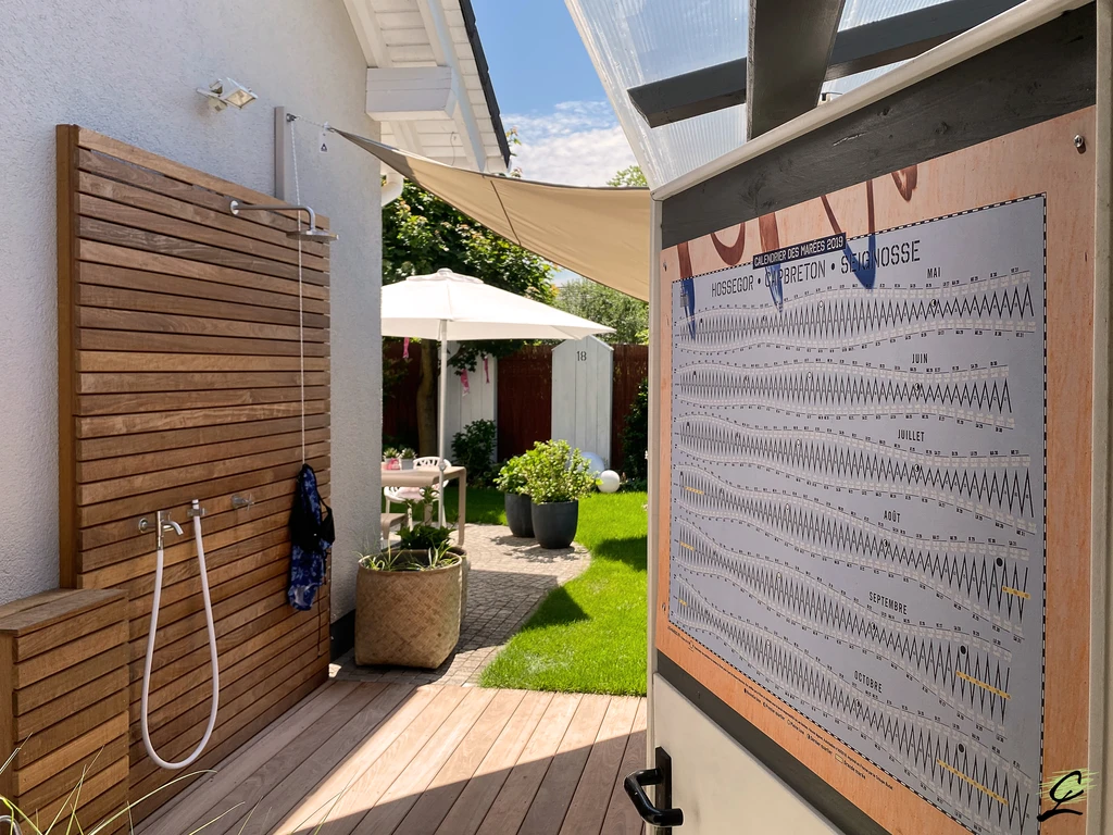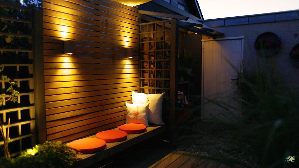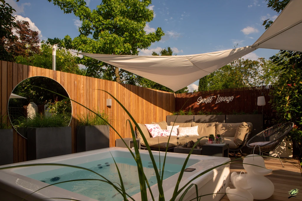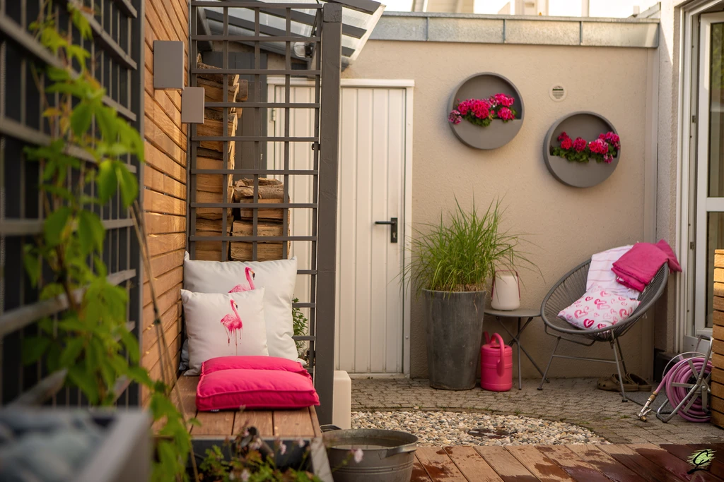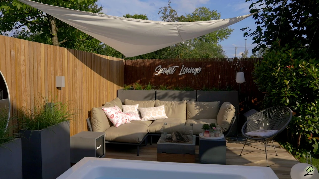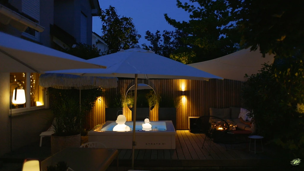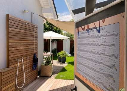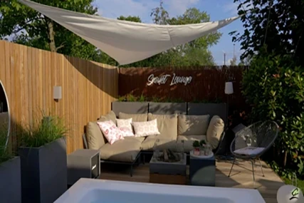 Bei diesen knapp 70 m² großen Garten ist jede Ecke optimal genutzt! Unterschiedliche, den Nutzungsbedingungen angepasste Materialien gliedern den Garten in verschiedene Räume und lassen ihn so deutlich größer erscheinen. Die Terrasse lädt ein, das Homeoffice nach draußen zu verlegen oder sich in der Lounge auf dem Holzdeck zu entspannen. Die dimmbare Gartenbeleuchtung schafft ein angenehmes Ambiente bis mitten in die Nacht. Verschiedene Pflanzen haben Raum in Hochbeeten und an Rankgittern und werden durch die Bewässerung optimal versorgt. Sie bilden einen gelungenen Kontrast zu den modernen Gartenmöbeln. Die raffinierte Kombination aus Sonnensegeln und Sonnenschirmen schafft ein angenehmes Klima an heißen Sommertagen. Das absolute Highlight stellt der Whirlpool mit der großzügigen Außendusche dar. Mit den Strandhäuschen-Attrappen entsteht ein richtiges Urlaubsgefühl.