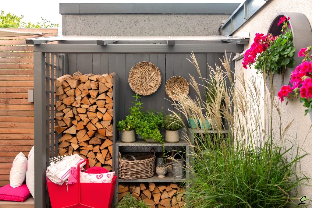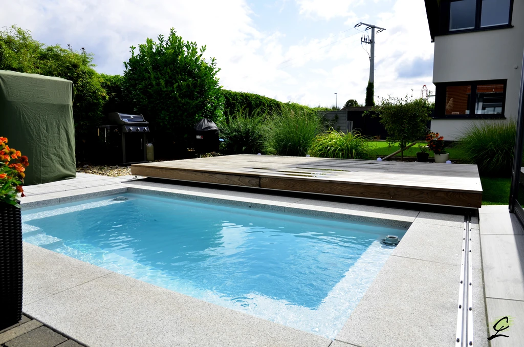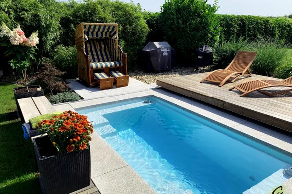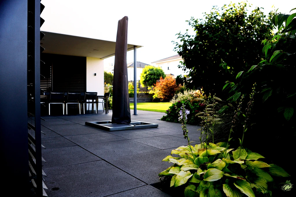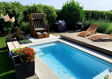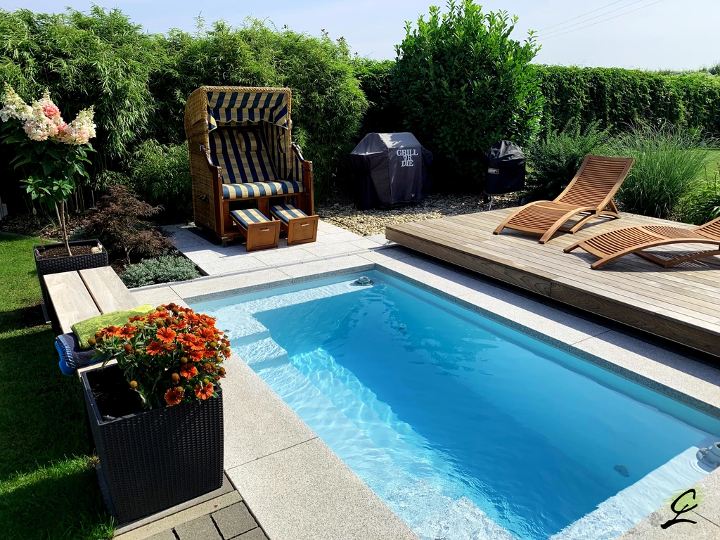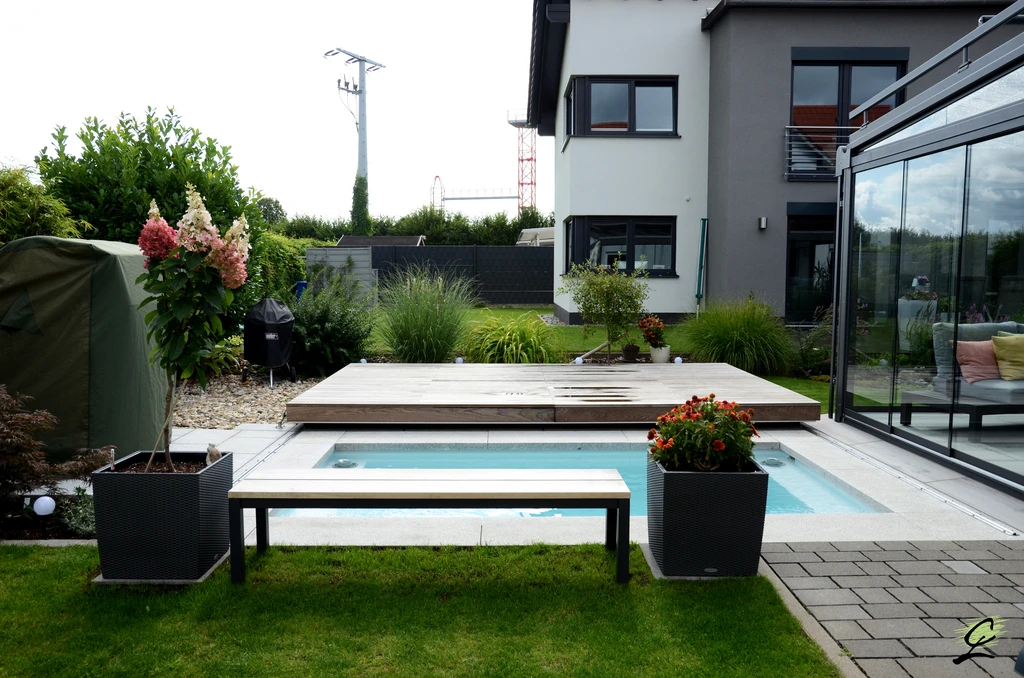 In diesem modernen Hausgarten wurde mit dem großzügigen Sommergarten ein „grünes Arbeitszimmer“ und zweites Wohnzimmer erschaffen. Er lädt schon bei den ersten warmen Sonnenstrahlen im Frühling ein, in der Lounge-Ecke zu entspannen. Angrenzend an den Sommergarten verspricht ein C-Side-Pool eine willkommene Abkühlung an heißen Tagen. Der Standkorb bietet eine schöne Möglichkeit zum Verweilen nach einem ausgiebigen Bad. Wird der Pool nicht genutzt, kann das Holzdeck kurzerhand darüber geschoben werden und fungiert sowohl als erweiterte Terrasse als auch als Abdeckung.
