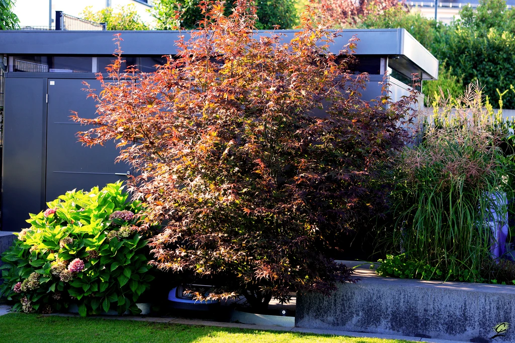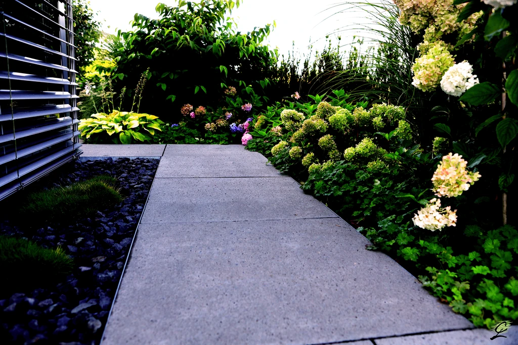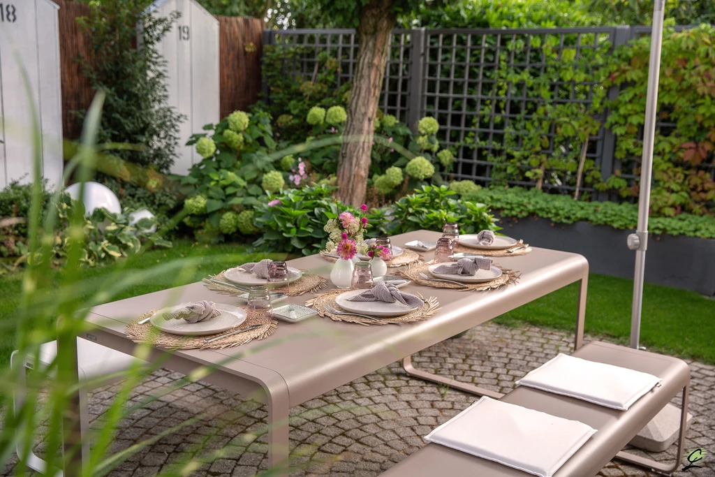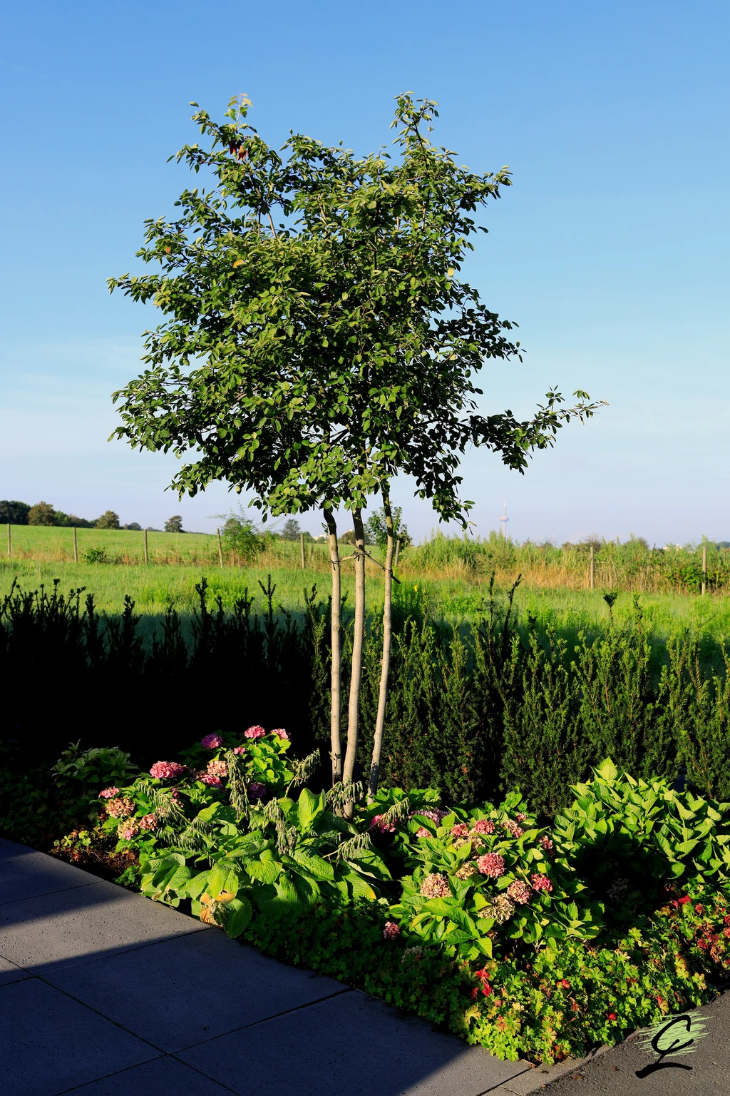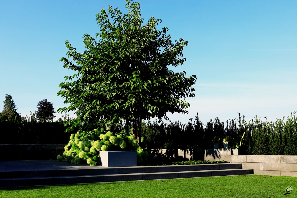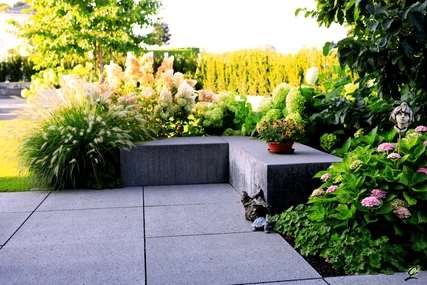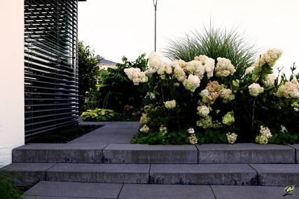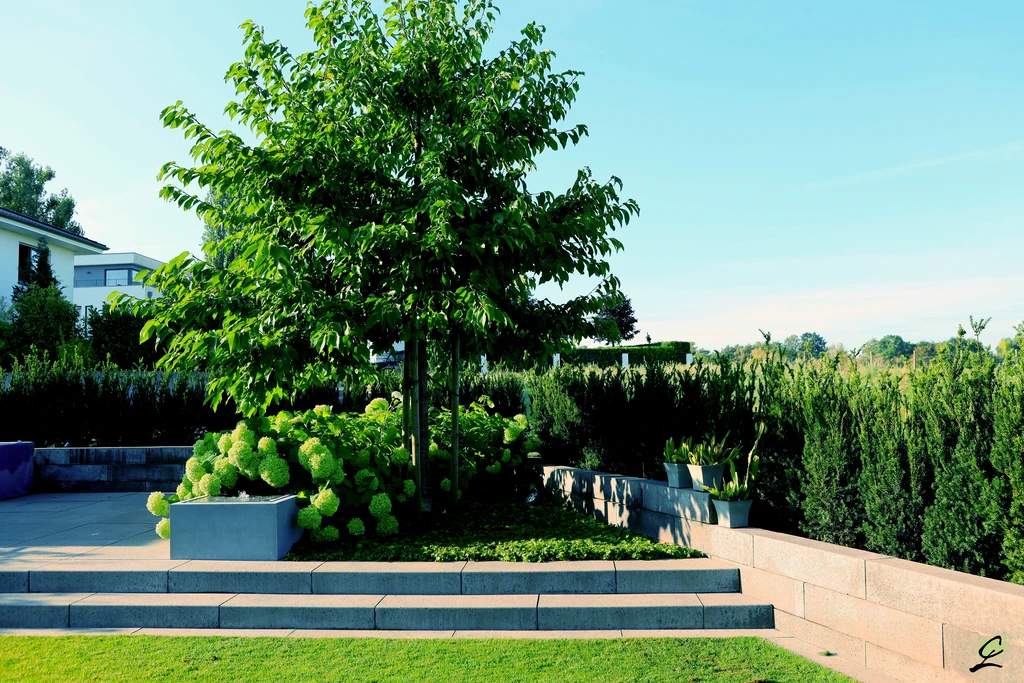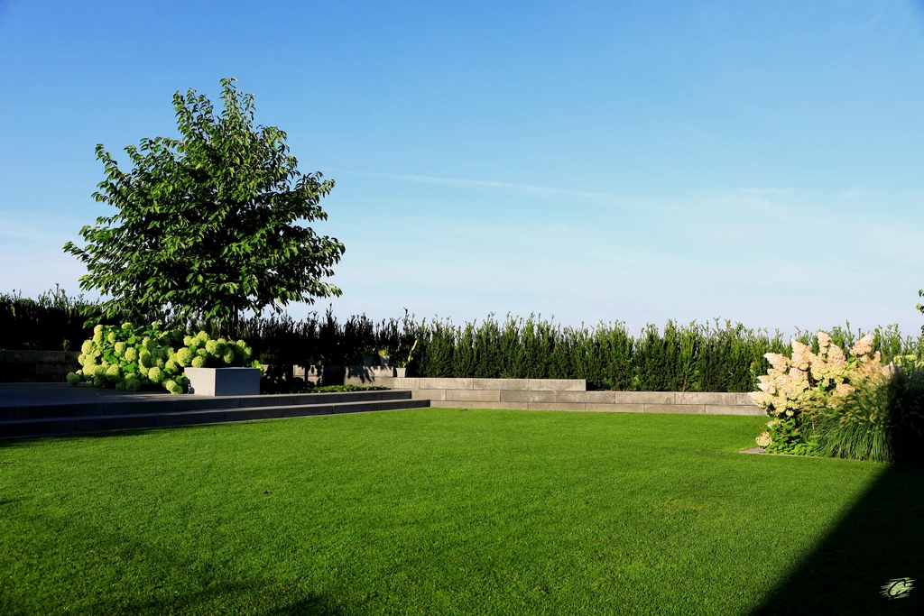 Der in Bad Vilbel gelegene knapp 450 m² große Hausgarten in Feldrandlage zeichnet sich durch gerade Formen, einheitliches Material und ruhige Bepflanzung aus. Alle befestigten Flächen und Stufen sind aus dem gleichen Kunststeinmaterial der Firma Schellevis® hergestellt. Dies erzeugt ein homogenes Bild. Die niedrigen Mauern, Sitzblöcke und Stufenanlagen schaffen verschiedene Ebenen und begradigen so den Garten insgesamt. Von einem seitlichen Parkplatz führt ein Plattenweg, gesäumt von Hortensien, Gräsern und verschiedenen Bodendeckern, zur teilweise überdachten Terrasse. Von dort eröffnet sich der Blick in den gesamten Garten und auf den zwei Stufen höhergelegenen Bereich mit Lounge-Ecke und Quellbrunnen. Ein rotlaubiger japanischer Ahorn verdeckt die Sicht sowohl auf das moderne Gerätehaus als auch auf den Mähroboter. Die umlaufende Mähkante ermöglicht ein sauberes Mähbild des Roboters.
