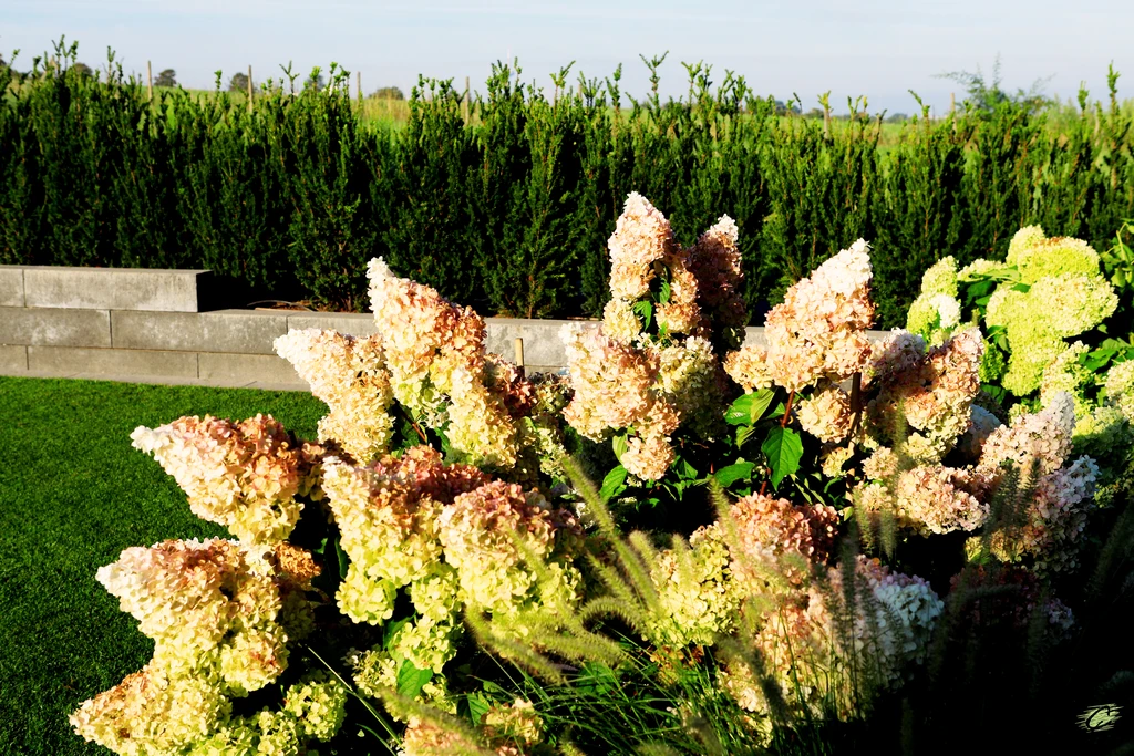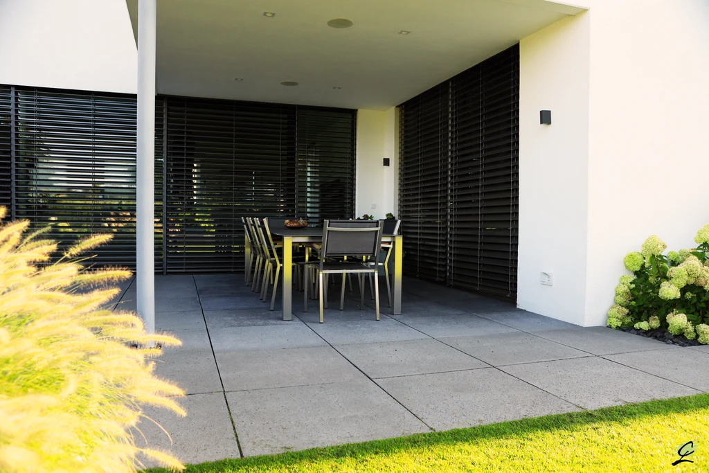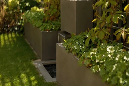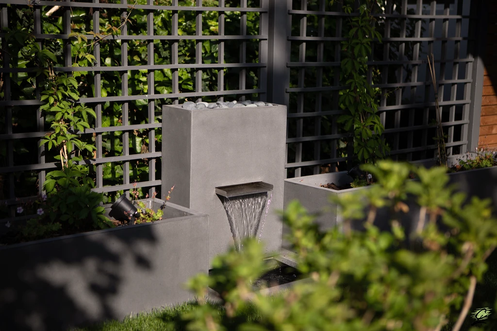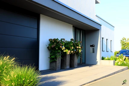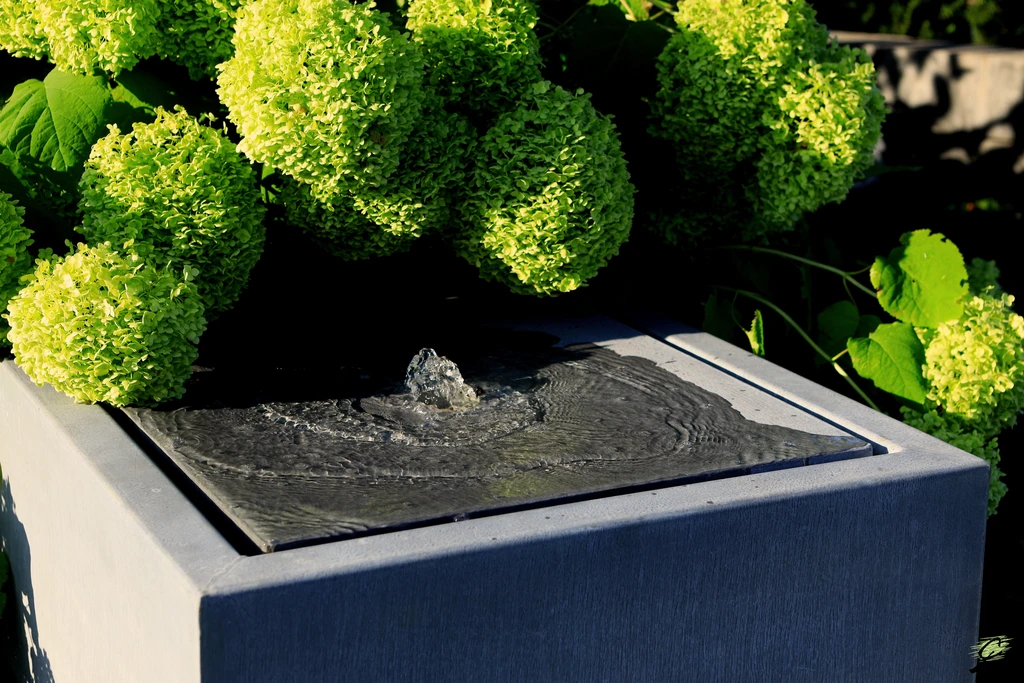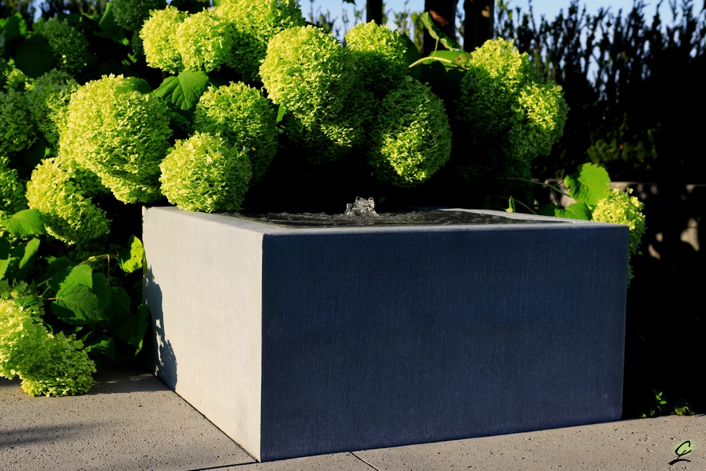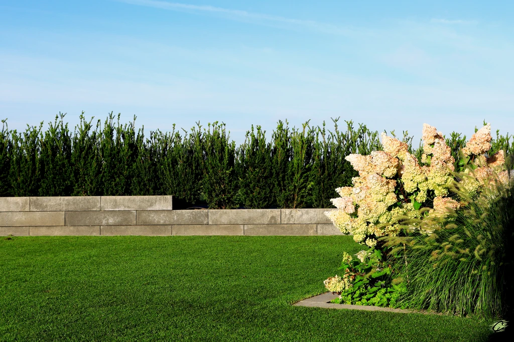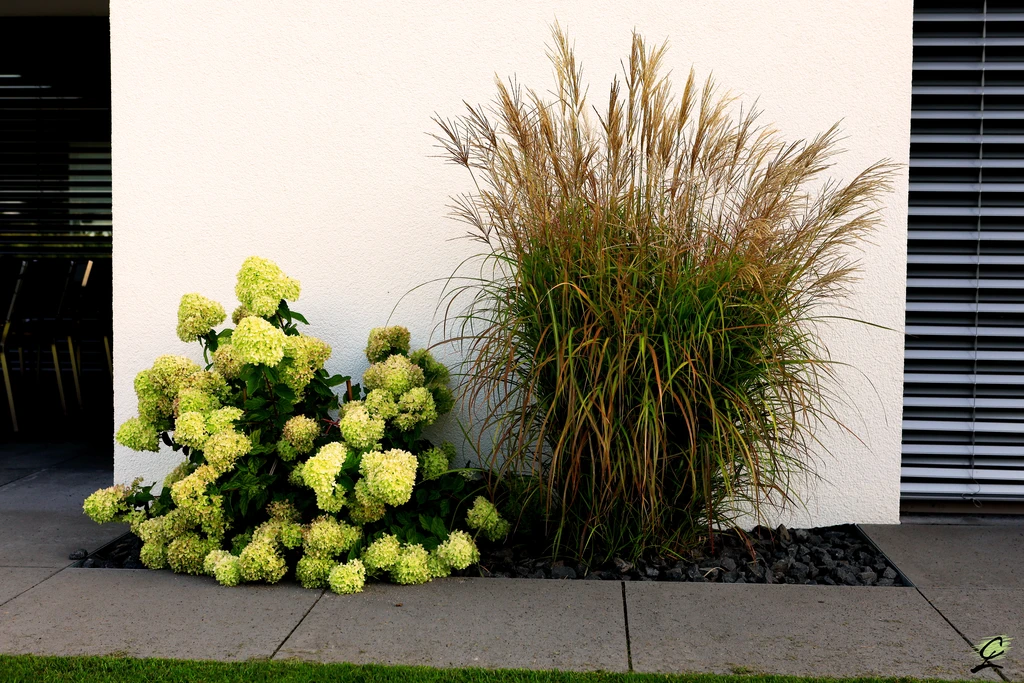 Der in Bad Vilbel gelegene knapp 450 m² große Hausgarten in Feldrandlage zeichnet sich durch gerade Formen, einheitliches Material und ruhige Bepflanzung aus. Alle befestigten Flächen und Stufen sind aus dem gleichen Kunststeinmaterial der Firma Schellevis® hergestellt. Dies erzeugt ein homogenes Bild. Die niedrigen Mauern, Sitzblöcke und Stufenanlagen schaffen verschiedene Ebenen und begradigen so den Garten insgesamt. Von einem seitlichen Parkplatz führt ein Plattenweg, gesäumt von Hortensien, Gräsern und verschiedenen Bodendeckern, zur teilweise überdachten Terrasse. Von dort eröffnet sich der Blick in den gesamten Garten und auf den zwei Stufen höhergelegenen Bereich mit Lounge-Ecke und Quellbrunnen. Ein rotlaubiger japanischer Ahorn verdeckt die Sicht sowohl auf das moderne Gerätehaus als auch auf den Mähroboter. Die umlaufende Mähkante ermöglicht ein sauberes Mähbild des Roboters.