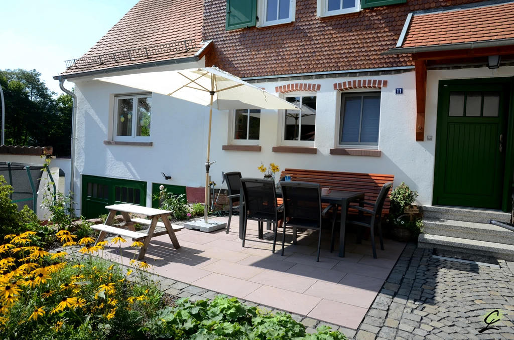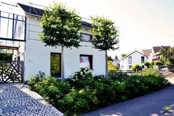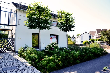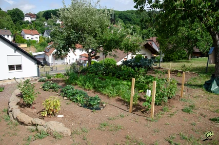Das ca. 550 m² große Grundstück liegt am Feldrand in einem Stadtteil von Wächtersbach. Es ist eingerahmt mit einem Hochbeet aus einer Basaltmauer und einer artenreichen und pflegeleichten Staudenpflanzung. Neben Schutz vor neugierigen Blicken ist die Pflanzung auch Nahrungsquelle für viele verschiedene Bienen und andere Insekten. Die schon durch das Hochbeet vorgegebene geradlinige Struktur setzt sich im restlichen Garten fort. Ein Weg verbindet den großzügigen Hof aus Betonpflaster mit der teilweise überdachten Terrasse. Diese ist aus großformatigen Keramikplatten in gebundener Bauweise erstellt. Von hier aus bietet sich ein schöner Blick in das Grün der Umgebung und auf den schattenspendenden Baum am Rand der Rasenfläche. Hinter dem Haus befindet sich noch eine Gerätehütte, die sich durch Ihren grauen Anstrich harmonisch in das Gesamtbild einfügt.