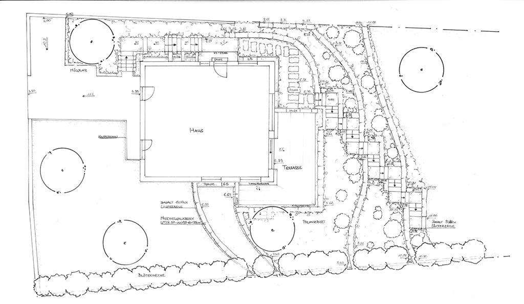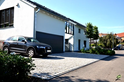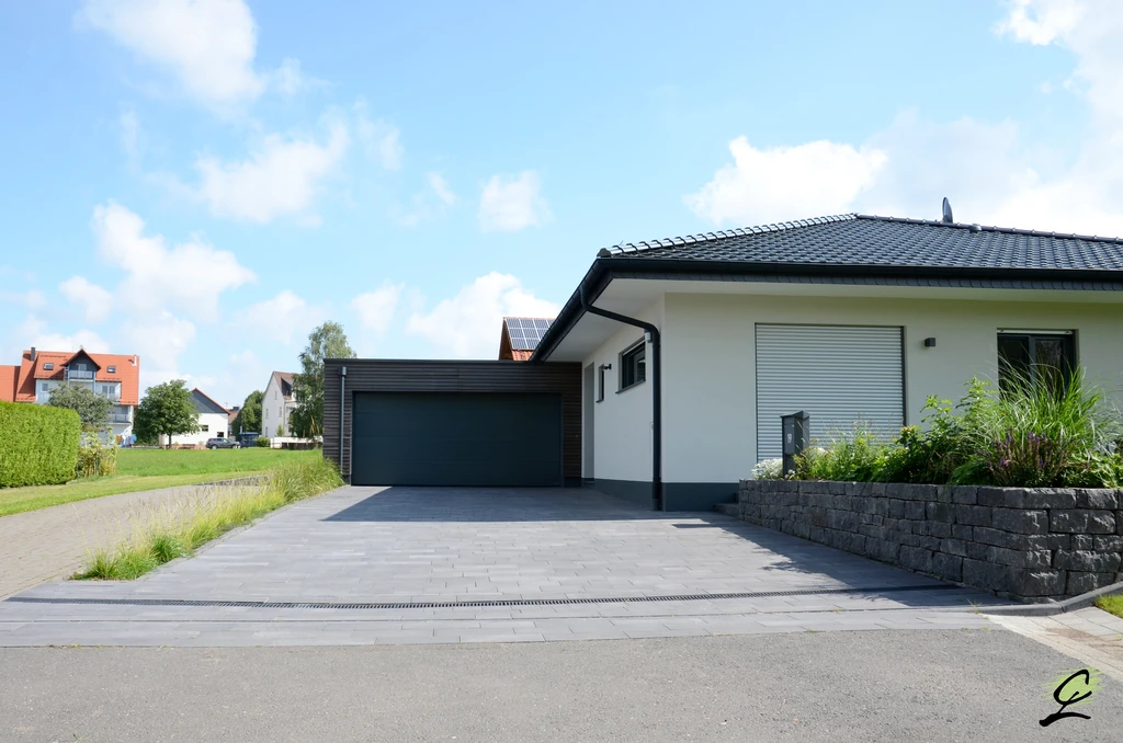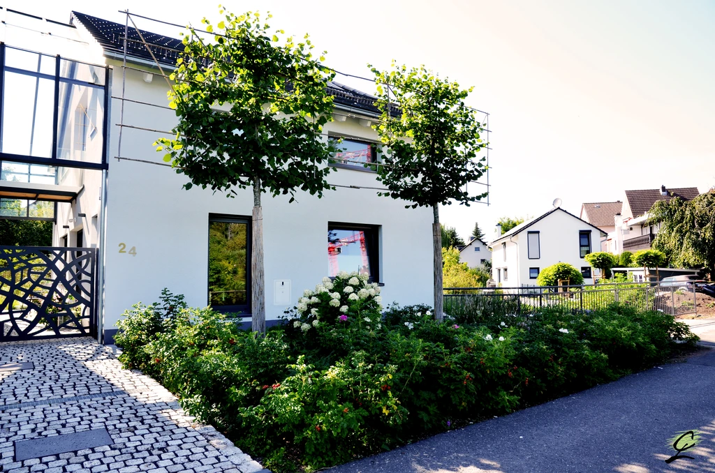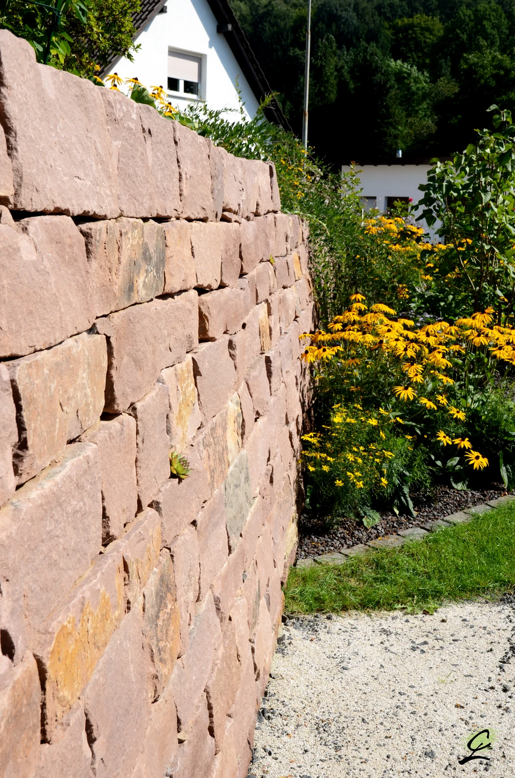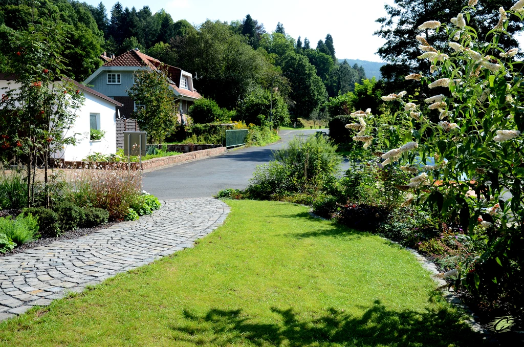 Bei diesem Grundstück in Gründau spielt sich das Leben im knapp 300 m² großen Vorgarten hab. Nach der Kernsanierung des Hauses war auch der Vorgarten an der Reihe. Zuerst wurden die gut erhaltenen Basalt-Pflastersteine für den späteren Wiedereinbau gesichert. Den vormals durch eine Betonmauer gestützten Hang fängt jetzt eine Trockenmauer aus heimischem roten Sandstein ab. Oberhalb befindet sich eine großzügige Terrasse aus Sandstein direkt neben dem Eingang. Sie wird eingerahmt von einer artenreichen und pflegeleichten Pflanzung die sowohl Sichtschutz bietet als auch durch ihre lange Blütezeit erfreut. Der Weg vom Eingang bis zur Straße wurde im Segmentbogenverband aus dem zuvor ausgebauten Basalt-Kleinsteinpflaster angelegt. Den Kreuzungspunkt mit dem Weg zum unteren Bereich des Hauses bildet eine Kreispflasterung aus Sandstein-Kleinsteinpflaster. Die großzügige Rasenfläche lädt zum Spielen ein.