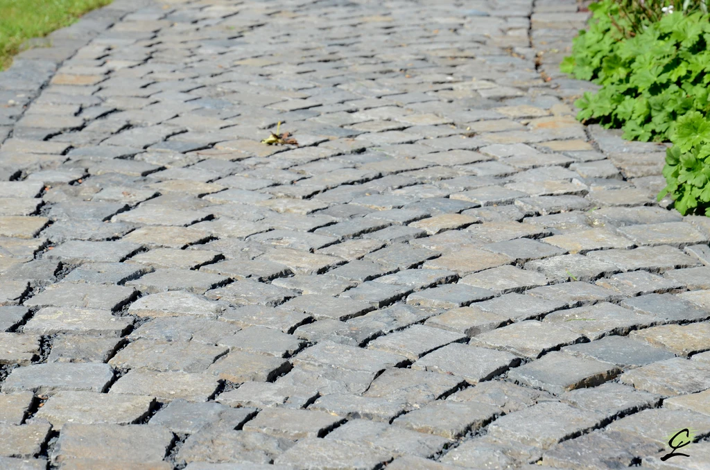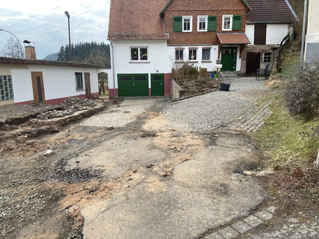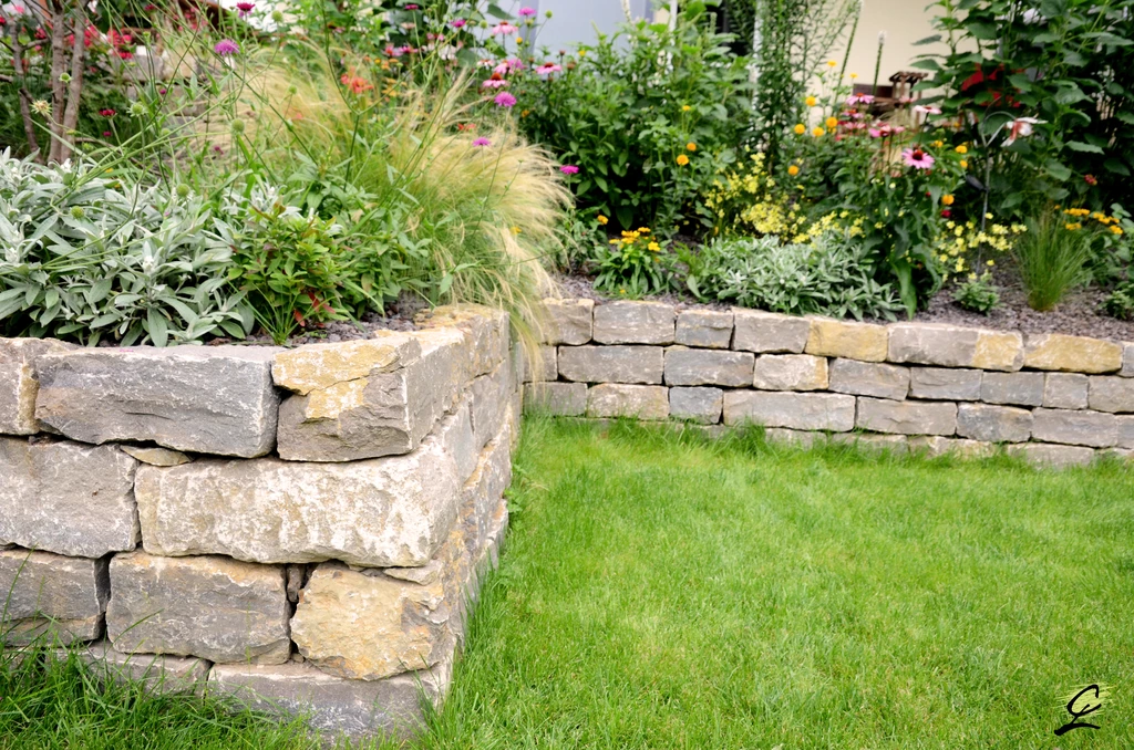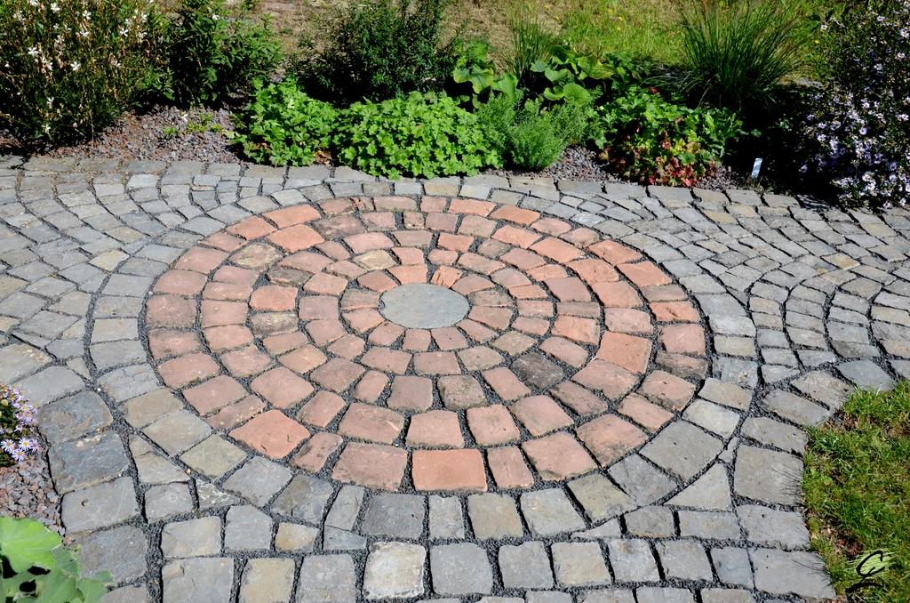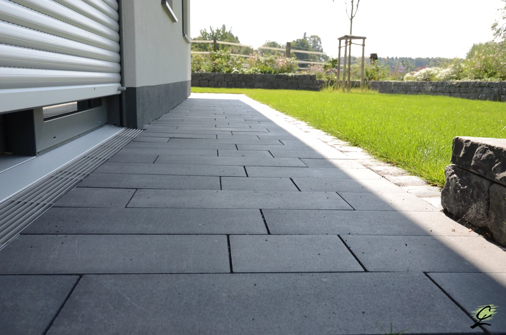 Bei diesem Grundstück in Gründau spielt sich das Leben im knapp 300 m² großen Vorgarten hab. Nach der Kernsanierung des Hauses war auch der Vorgarten an der Reihe. Zuerst wurden die gut erhaltenen Basalt-Pflastersteine für den späteren Wiedereinbau gesichert. Den vormals durch eine Betonmauer gestützten Hang fängt jetzt eine Trockenmauer aus heimischem roten Sandstein ab. Oberhalb befindet sich eine großzügige Terrasse aus Sandstein direkt neben dem Eingang. Sie wird eingerahmt von einer artenreichen und pflegeleichten Pflanzung die sowohl Sichtschutz bietet als auch durch ihre lange Blütezeit erfreut. Der Weg vom Eingang bis zur Straße wurde im Segmentbogenverband aus dem zuvor ausgebauten Basalt-Kleinsteinpflaster angelegt. Den Kreuzungspunkt mit dem Weg zum unteren Bereich des Hauses bildet eine Kreispflasterung aus Sandstein-Kleinsteinpflaster. Die großzügige Rasenfläche lädt zum Spielen ein.