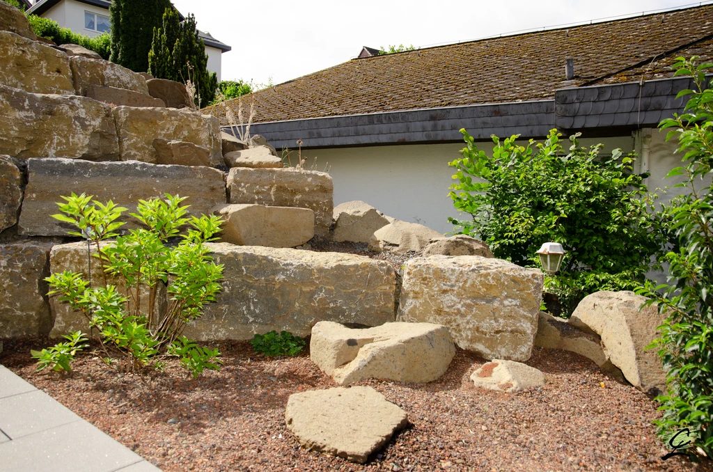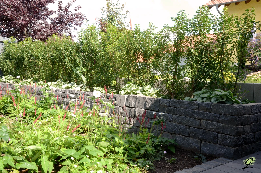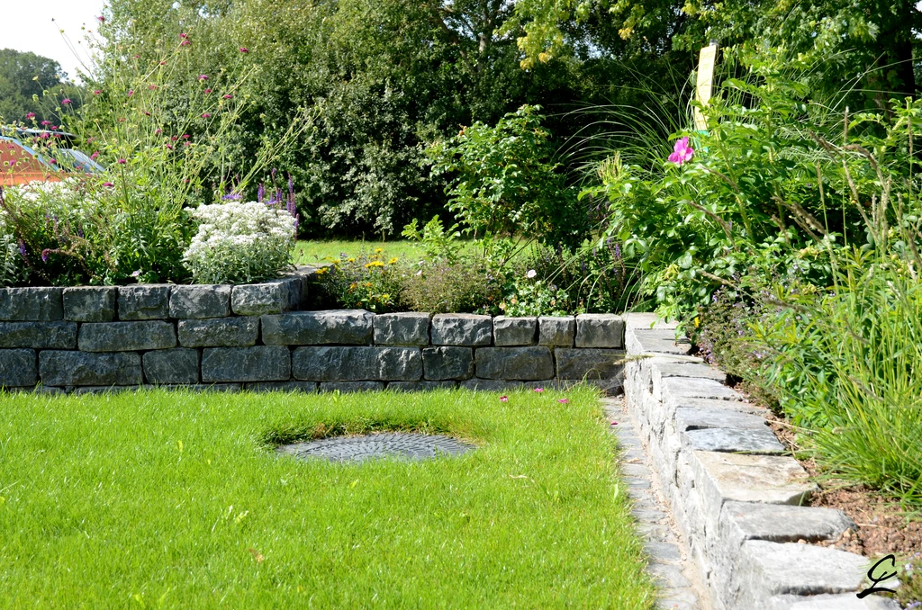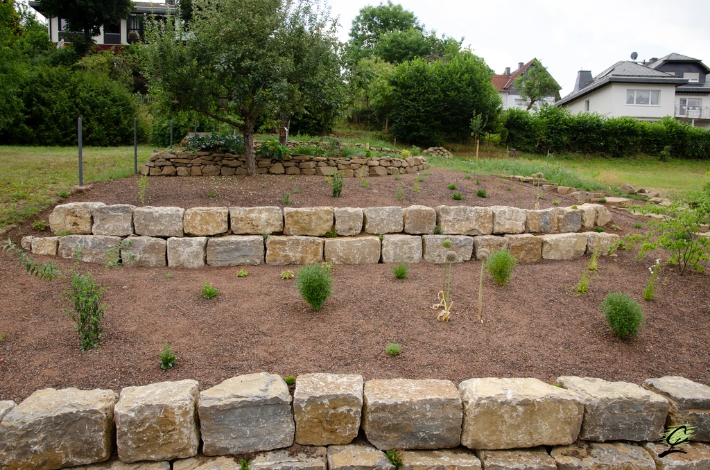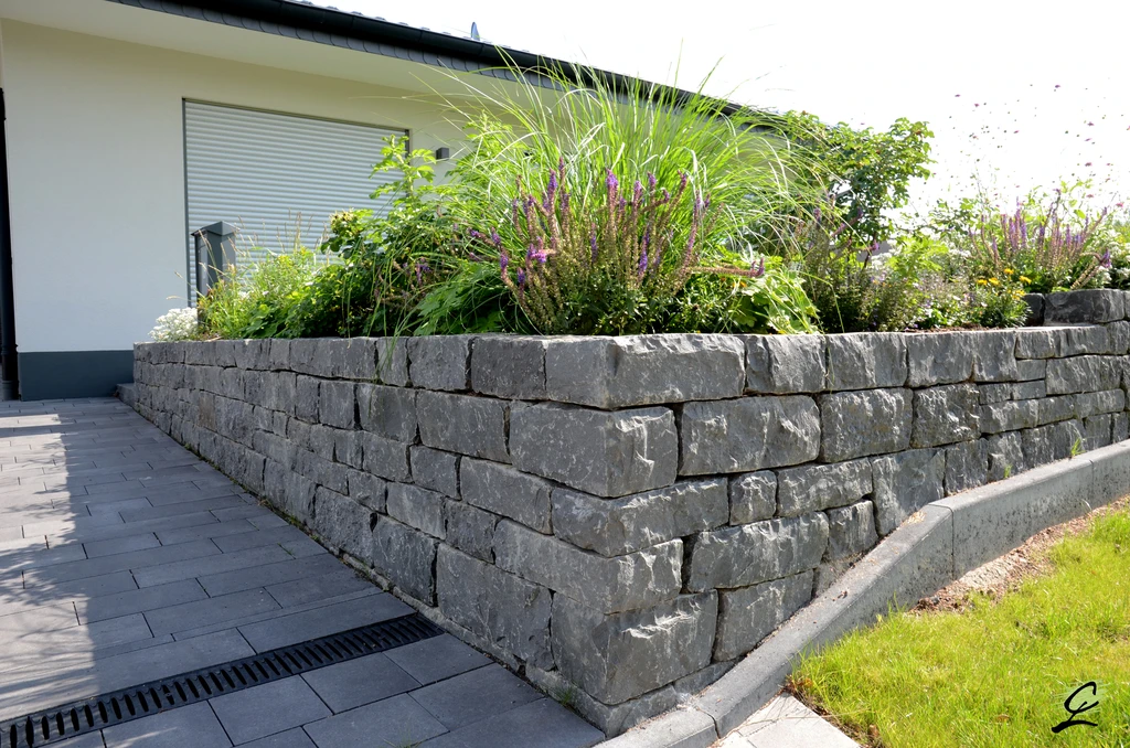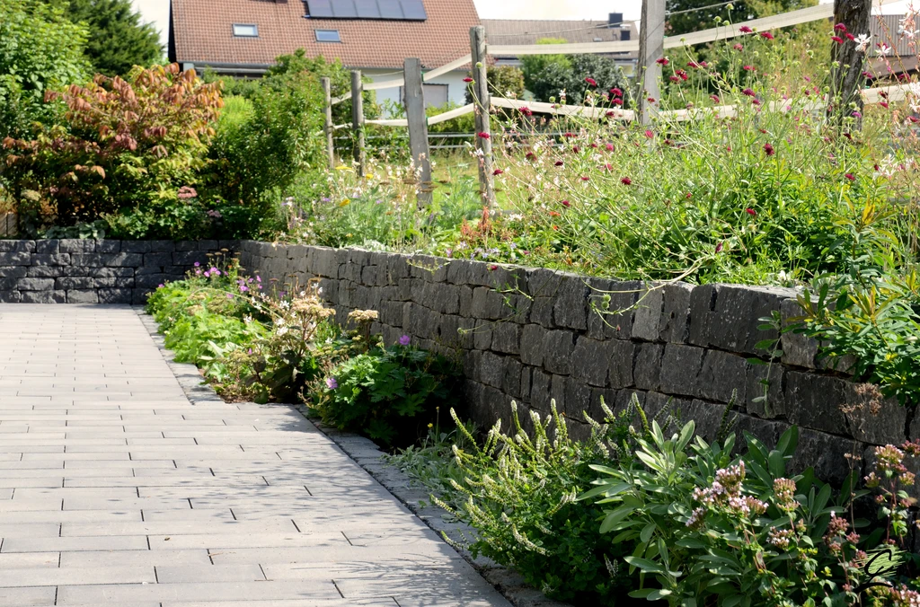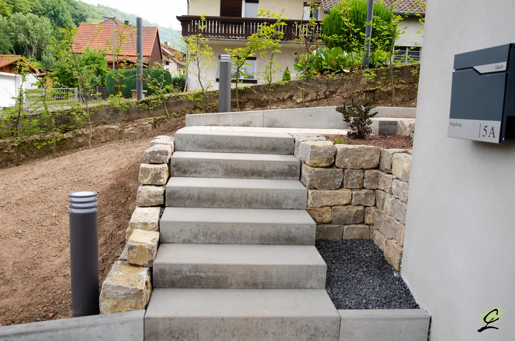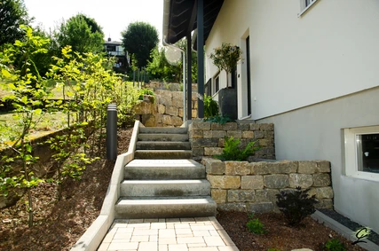 Auf dem knapp 700 m² großen Grundstück wurde ein neues Einfamilienhaus errichtet. Im Zuge dessen wurde die Außenanlage, insbesondere die Hangabfangung, der Eingangsbereich und die Terrasse gestaltet. Im Vorfeld erfolgte eine Planung mit Kostenschätzung durch unser Team. Während den Erdarbeiten für das Haus stellte sich heraus, dass die Erde eine Vielzahl von Basaltfindlingen enthält. Mit diesem Wissen im Hintergrund wurde die Terrassierung reduziert und die geplante Treppe durch den Hang deutlich vereinfacht, da so weniger Erde abgetragen werden musste. Nun ist der Hang in zwei Ebenen mit heimischen Muschelkalk-Quadern im hinteren Bereich des Hauses abgefangen. Die untere ca. 2,5 m hohe Mauer ist leicht in Richtung Hang geneigt und die größeren Fugen sind mit verschiedenen Mauerpflanzen begrünt. Seitlich fächert sich die Mauer auf und bildet so einen fließenden Übergang in die Schräge an den Grundstücksgrenzen. Von der großen L-förmigen Terrasse gelangt man über Trittsteine und Stufen aus vorhandenen Basaltfindlingen zum oberen Bereich des Grundstückes. Dort befindet sich auch ein Nutzgartenbereich. Der seitliche Hang zum etwas niedriger gelegenen Nachbarn wurde mit den ausgegrabenen Findlingen stabilisiert. Im Eingangsbereich bildet das Betonpflaster mit der gebrochenen Kante eine schöne Verbindung zwischen der Trockenmauer und den geraden Blockstufen und Einfassungen aus Beton.