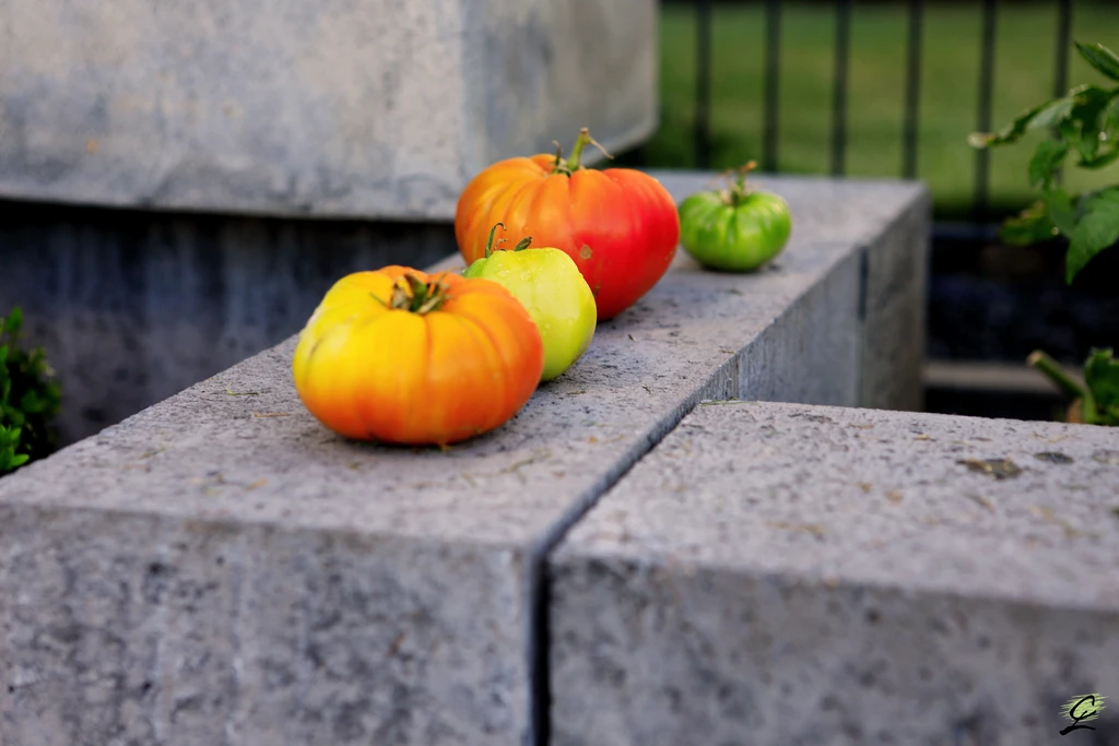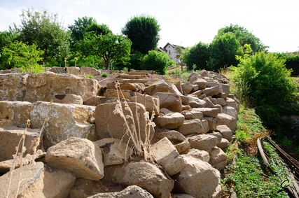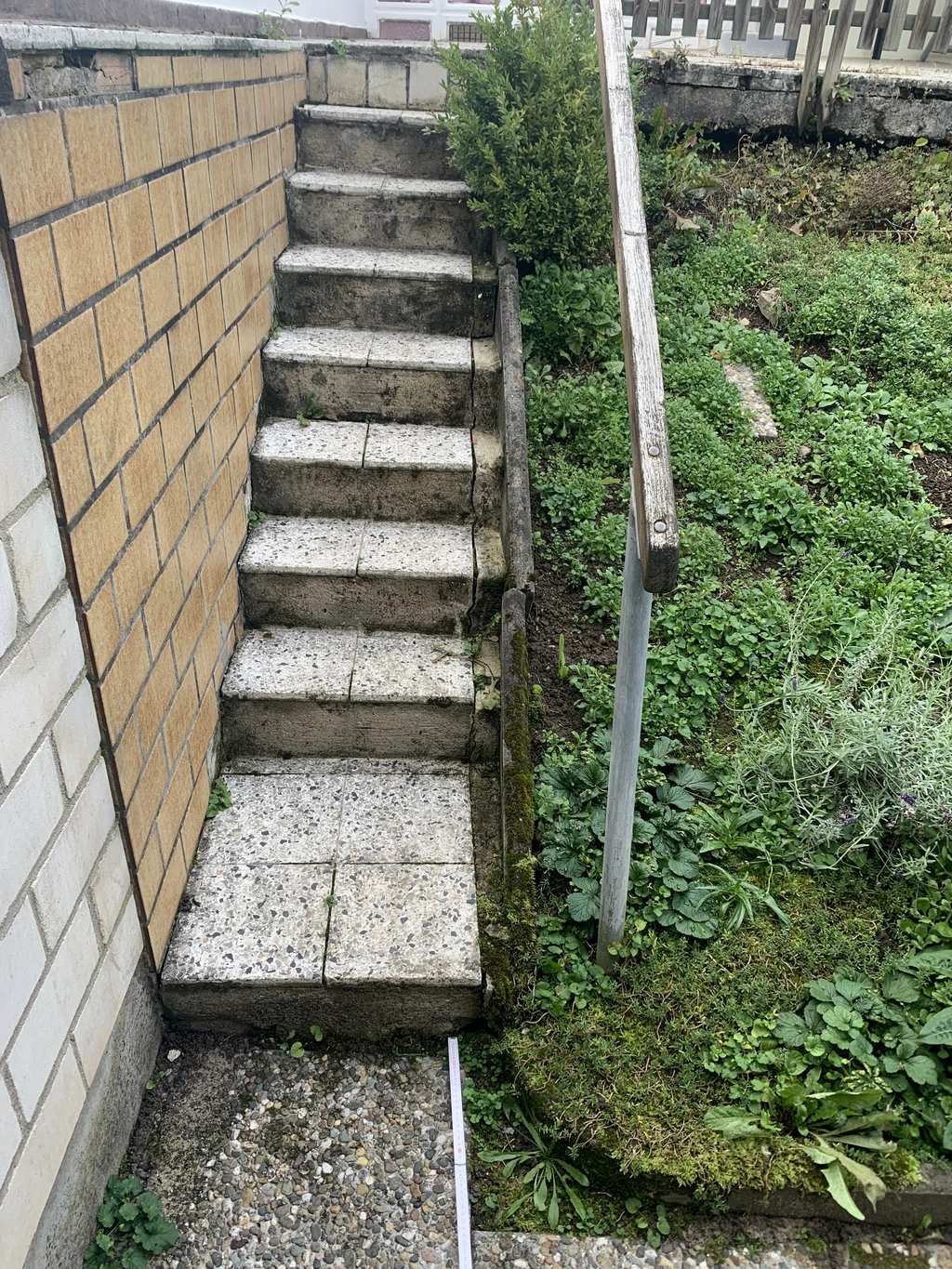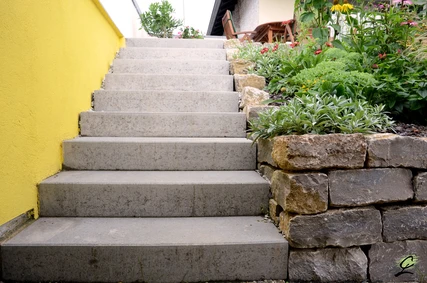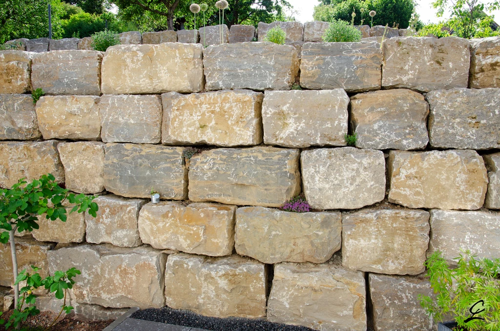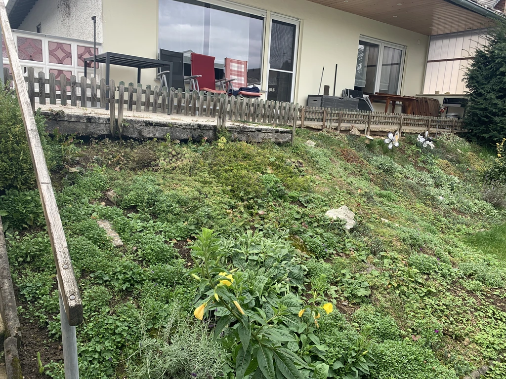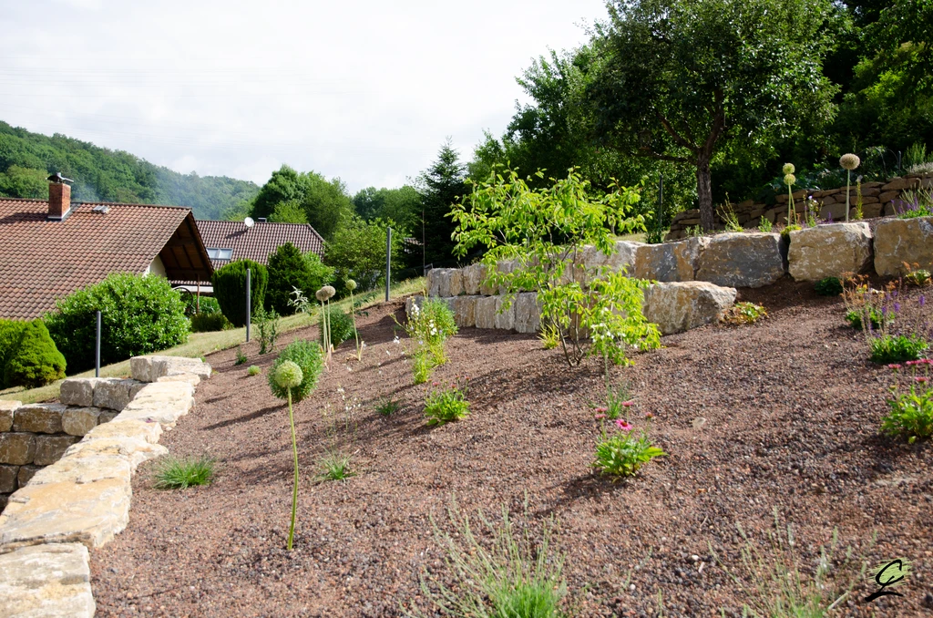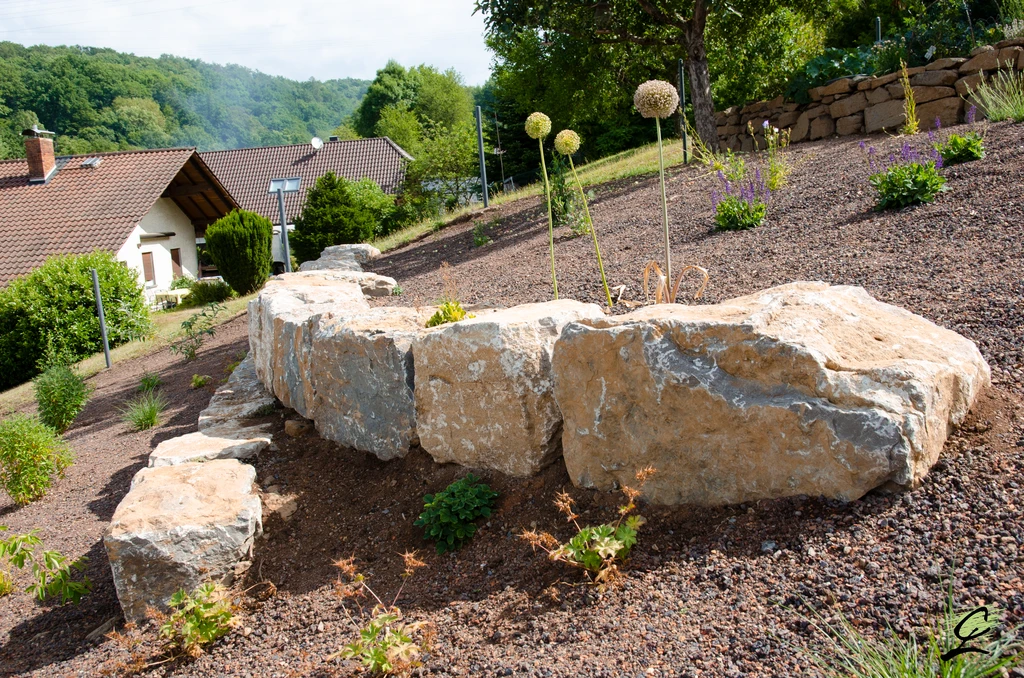 Auf dem knapp 700 m² großen Grundstück wurde ein neues Einfamilienhaus errichtet. Im Zuge dessen wurde die Außenanlage, insbesondere die Hangabfangung, der Eingangsbereich und die Terrasse gestaltet. Im Vorfeld erfolgte eine Planung mit Kostenschätzung durch unser Team. Während den Erdarbeiten für das Haus stellte sich heraus, dass die Erde eine Vielzahl von Basaltfindlingen enthält. Mit diesem Wissen im Hintergrund wurde die Terrassierung reduziert und die geplante Treppe durch den Hang deutlich vereinfacht, da so weniger Erde abgetragen werden musste. Nun ist der Hang in zwei Ebenen mit heimischen Muschelkalk-Quadern im hinteren Bereich des Hauses abgefangen. Die untere ca. 2,5 m hohe Mauer ist leicht in Richtung Hang geneigt und die größeren Fugen sind mit verschiedenen Mauerpflanzen begrünt. Seitlich fächert sich die Mauer auf und bildet so einen fließenden Übergang in die Schräge an den Grundstücksgrenzen. Von der großen L-förmigen Terrasse gelangt man über Trittsteine und Stufen aus vorhandenen Basaltfindlingen zum oberen Bereich des Grundstückes. Dort befindet sich auch ein Nutzgartenbereich. Der seitliche Hang zum etwas niedriger gelegenen Nachbarn wurde mit den ausgegrabenen Findlingen stabilisiert. Im Eingangsbereich bildet das Betonpflaster mit der gebrochenen Kante eine schöne Verbindung zwischen der Trockenmauer und den geraden Blockstufen und Einfassungen aus Beton.