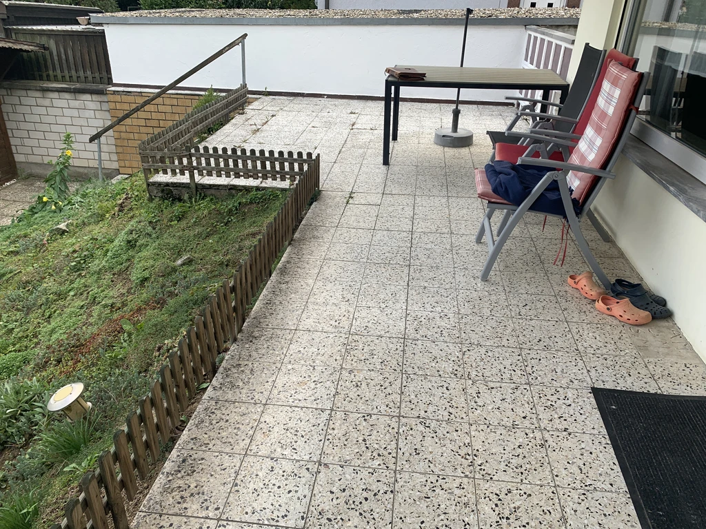 Die Keramikterrasse mit angrenzendem Staudenbeet und Treppe in den unteren Garten befindet sich in Schöneck. Sie ist die Sanierung einer baufällig gewordenen Fliesenterrasse mit beengter Treppe und einem sehr steilen Beet. Die abgestufte Trockenmauer aus heimischem Muschelkalk fängt die starke Steigung des Beetes gekonnt ab. Die Pflanzung sorgt durch die verschiedenen Höhen für einen gewissen Schutz auf der Terrasse, versperrt jedoch nicht den Blick in die Umgebung. Durch die passende Zusammenstellung ist sie pflegeleicht und zwischen April und November blüht immer etwas. Die aus Betonblockstufen hergestellte Treppe bietet einen dauerhaften und sicheren Zugang in den unteren Gartenbereich und ermöglicht aufgrund ihrer Breite von 1,0 m auch das Tragen von größeren Gegenständen. Der breite Terrassenbereich gewährt genügend Platz für Tisch und Stühle und lockt bei schönem Wetter die Sonnenstrahlen zu genießen. An heißen Tagen ist die geschützte Lounge-Ecke im überdachten Bereich der Terrasse der ideale Rückzugsort.
